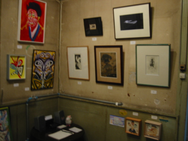 会合のテーブルそのままの会場で作品を見ていると、陶芸家の阿南くんと鉢合わせ。画家の谷くんと一緒に見にきたそうです。ほどなく三宮くんも現れ、会合の後片付けが簡単になされると、そこはようやく落ち着いた空間になりました。